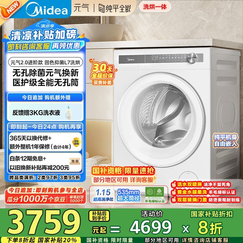 美的MD10L7PRO洗烘一体机京东优惠价3567元