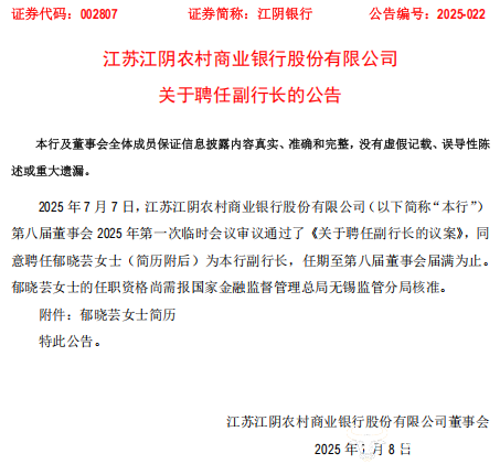 江阴银行新任 85后女副行长郁晓芸 履历扎实从基层一路提拔