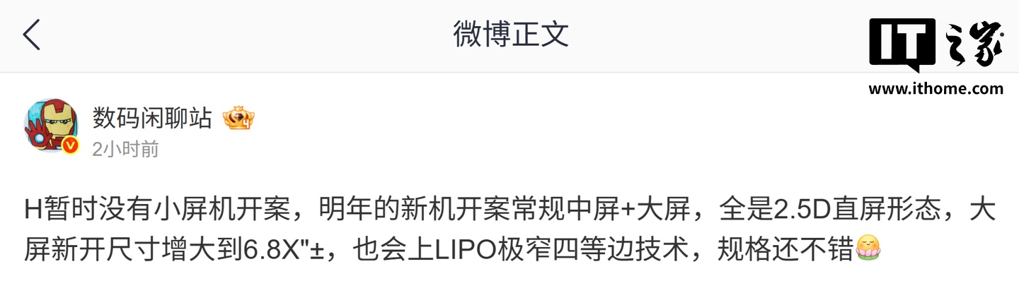 消息称某 H 厂暂无小屏手机开案,明年新机延续常规中屏 + 大屏、会上 LIPO 极窄四等边