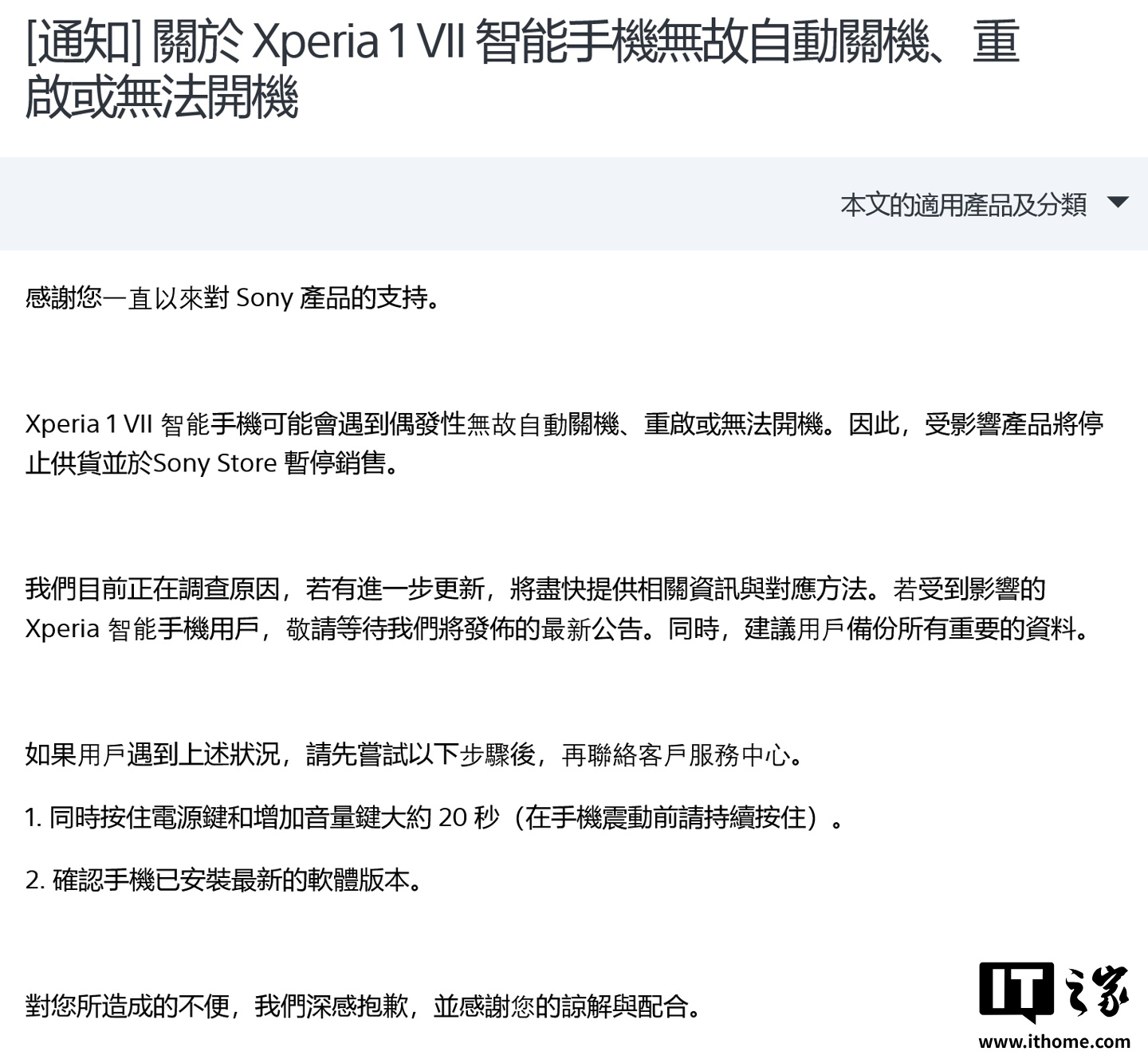 因无故关机 / 重启等故障,索尼在多地中止销售 Xperia 1 VII 手机